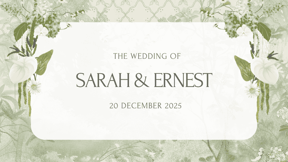 WEDDING INVITATION Sarah & Ernest 20 December 2025 The Wedding of Sarah & Ernest Dear Mr./Mrs./Ms./Sir/Madam OPEN INVITATION “And among His signs is that He created for you spouses from among yourselves, so that you may find tranquility in them; and He placed between you affection and mercy. Indeed, in that are signs for people […]