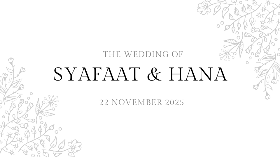 UNDANGAN PERNIKAHAN Syafaat & Hana 22 November 2025 THE WEDDING OF Syafaat & Hana Kepada Yth. Bapak/Ibu/Saudara/i OPEN INVITATION “Dan di antara tanda-tanda (kebesaran)-Nya ialah Dia menciptakan pasangan-pasangan untukmu dari jenismu sendiri, agar kamu cenderung dan merasa tenteram kepadanya, dan Dia menjadikan di antaramu rasa kasih dan sayang. Sungguh, pada yang demikian itu benar-benar terdapat […]